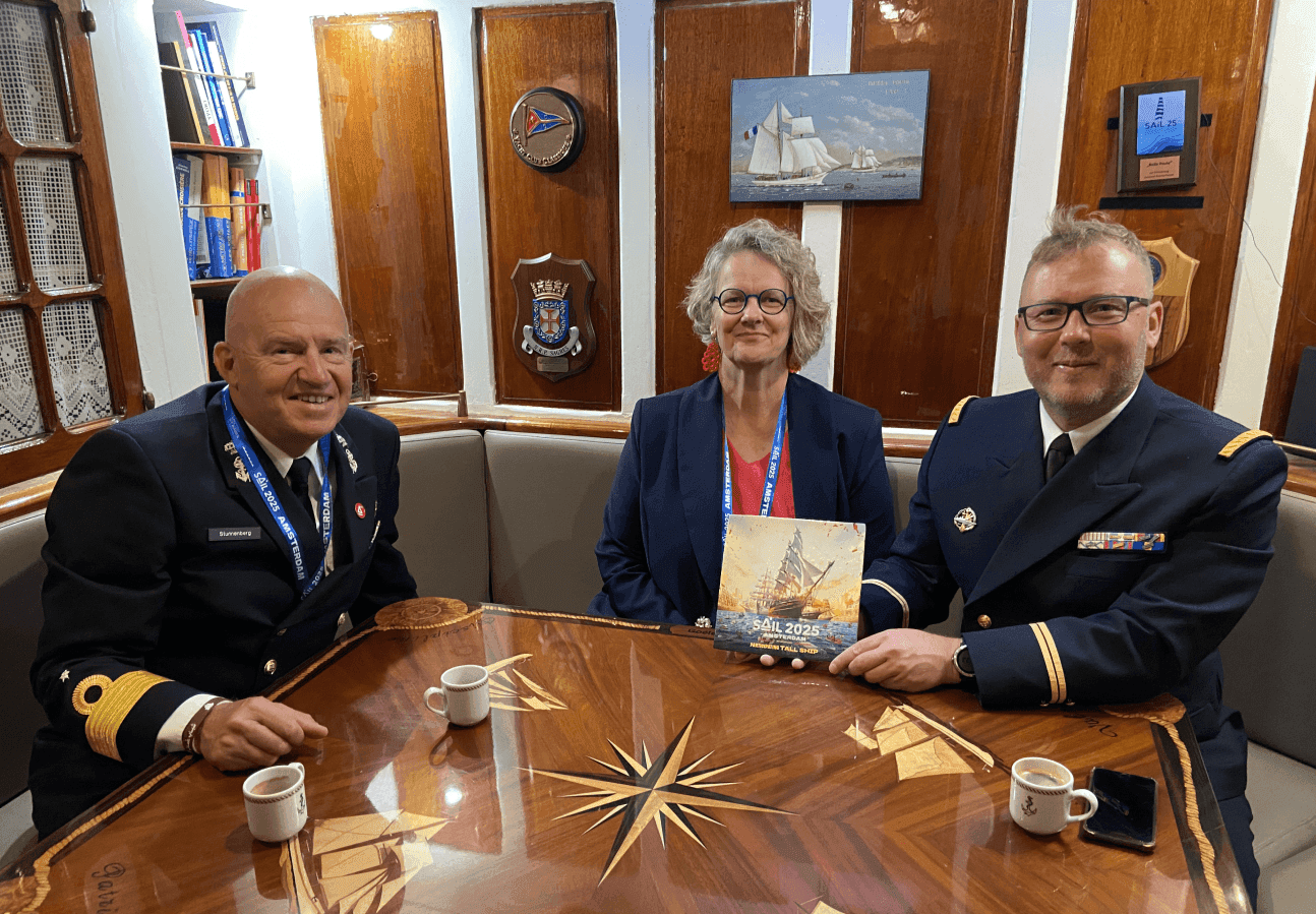 Gisterochtend bezocht een delegatie van het SAIL-bestuur alle Tall Ships om de bemanning en kapiteins persoonlijk te bedanken voor hun deelname aan SAIL 2025. Vicevoorzitter Marjolein H.T. Jansen en bestuurslid Pedro R.G. Stunnenberg werden bij het Franse marineschip La Belle Poule zelfs onthaald met een traditionele fluitceremonie. Namens SAIL overhandigden zij een cadeau aan de kapitein.