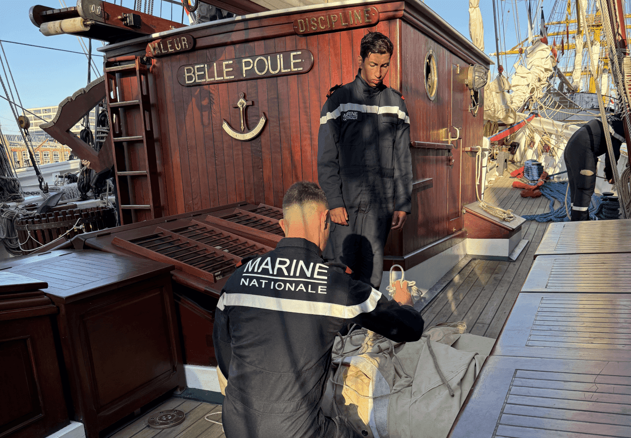 De laatste dag van SAIL 2025 is aangebroken. Na het appèl van 08.00 uur en het hijsen van de Franse vlag begon de bemanning van La Belle Poule met de voorbereidingen voor hun vertrek.