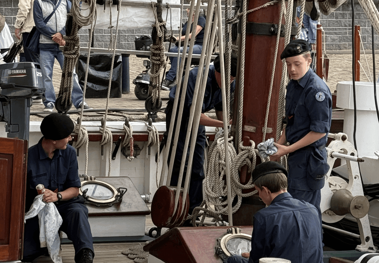 Zodra de trossen losgingen, klommen tientallen cadetten behendig het want in. Hoog op de ra’s namen ze positie: manning the yards. Ooit een praktisch gebruik, nu een groet vol respect en trots. Tegen de blauwe lucht zwaaiden de zeelieden naar de kade en veranderden het vertrek in een adembenemend zeetheater. 👋🌊