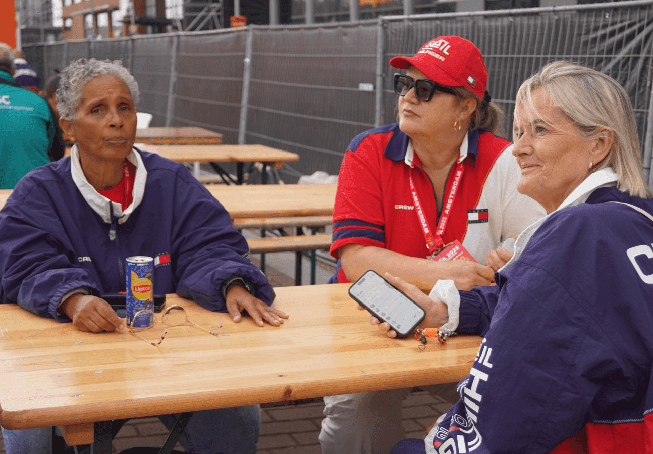 In het productiedorp lunchen drie merchandise-coördinatoren, even op adem na een drukke ochtend. Zij zorgen dat de verkooppunten bemand zijn en alles soepel verloopt. “Het gaat hartstikke goed,” vertellen ze. “’s Avonds moeten er zelfs extra shirts en hoodies gedrukt worden om aan de vraag te voldoen. We werken met hele leuke en flexibele vrijwilligers, Iedereen helpt mee waar dat nodig is.” 💪