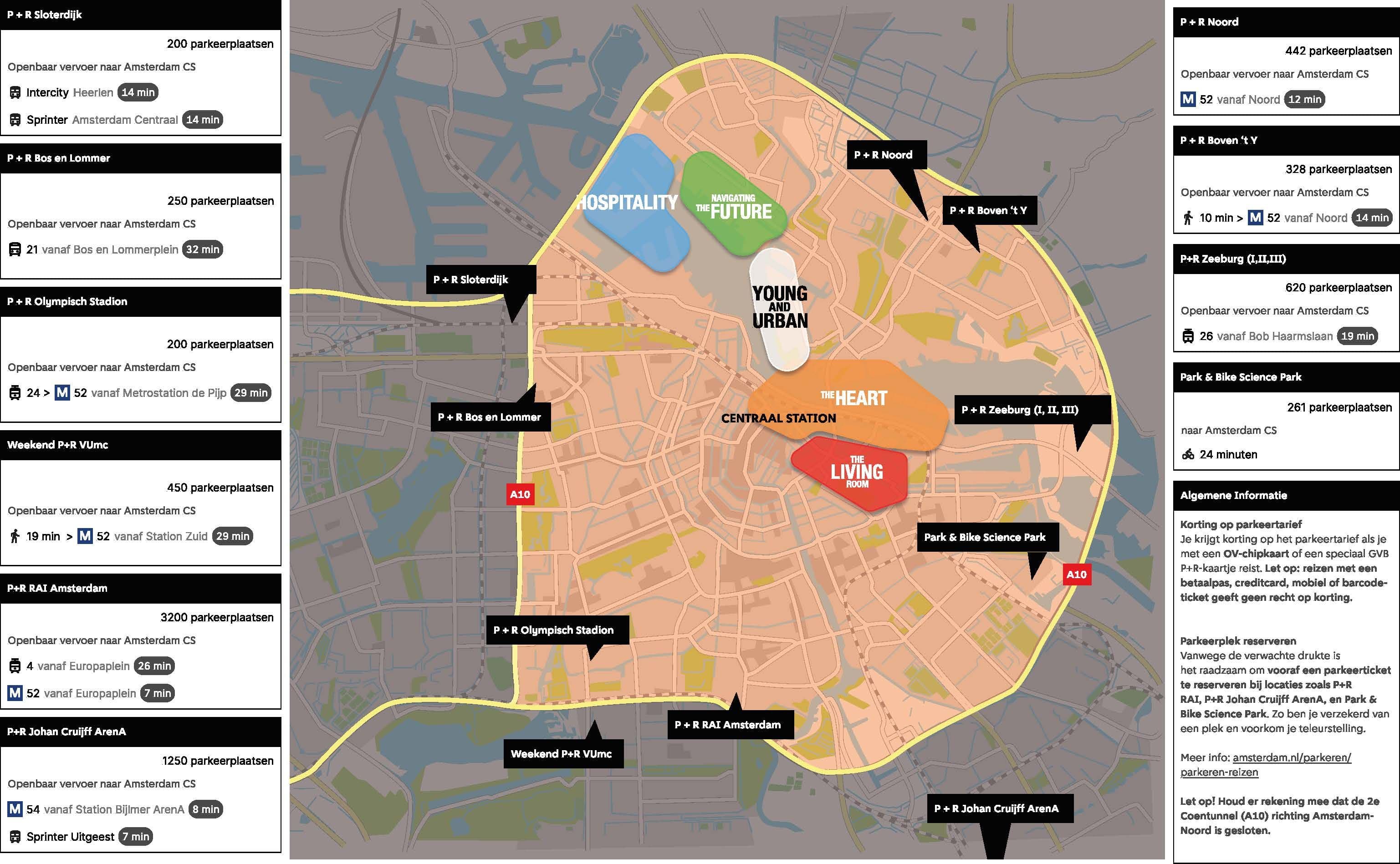 Het centrum van Amsterdam zal druk zijn voor autoverkeer. Kies daarom één van de alternatieve reisopties of maak gebruik van de dichtsbijzijnde parkeeropties in de RAI of Johan Cruijff ArenA.