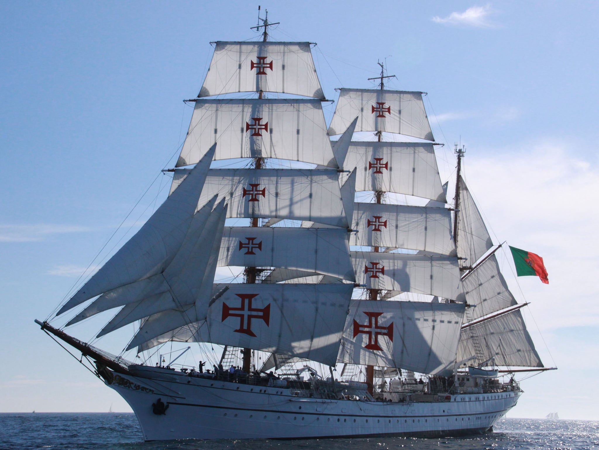 With her square sails, with the Christ's Cross, she is one of the most beautiful tall ships in the world and already recognizable from a distance. She was launched in 1937 in Hamburg, at the yard of Blohm & Voss, under the name Albert Leo Schlageter. She is a sister ship of the Gorch Fock (ex-Tovarich), which is now a museum ship in Stralsund, Germany; the Eagle, of United States Coast Guard (firstly named Horst Wessel); the Mircea of Romanian Navy, and the Gorch Fock II, of German Navy. After the Second World War, the ship was confiscated by the United States. Sold to Brazil in 1948 and used as a sail training ship, under the name Guanabara, by Brazilian Navy until 1960. In that year she was taken out of service.
