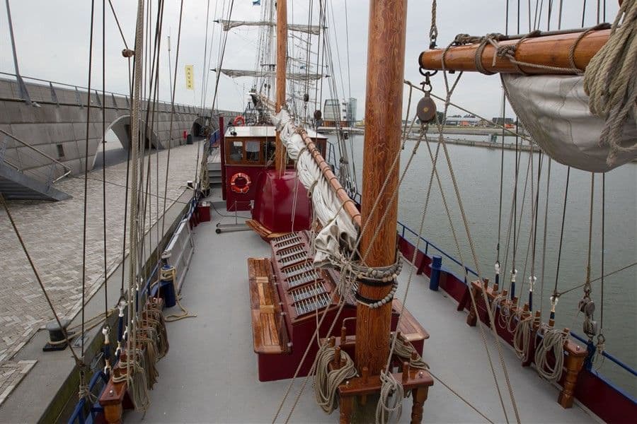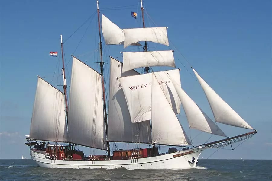 With her snow-white hull, numerous sails and teak superstructure, the Willem Barentsz is a majestic sight. This top sail schooner is finished in every detail. In the deckhouse is the cosy bar and below deck are two more saloons with a warm teak interior. On deck, you can enjoy SAIL in luxury on one of the benches.