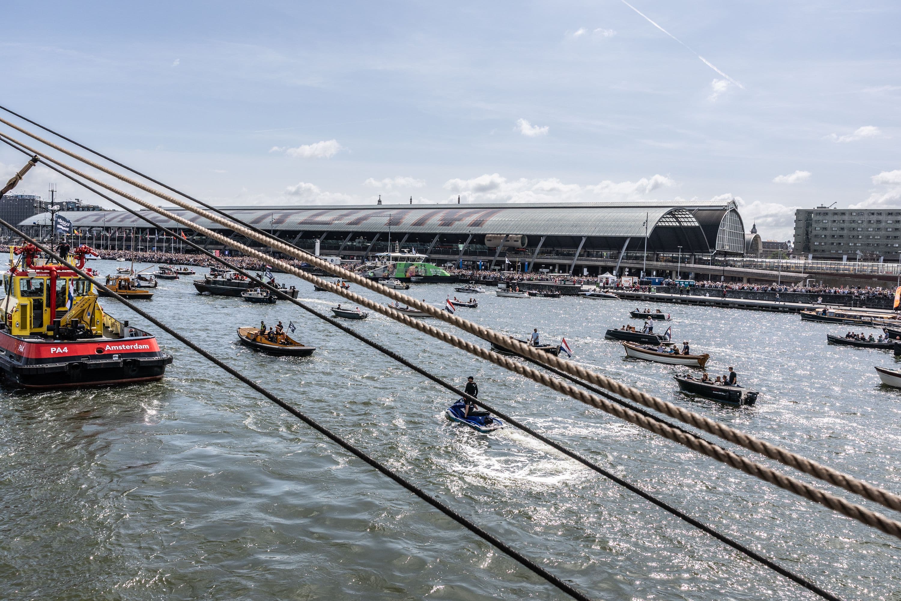 De Clipper Stad Amsterdam ligt inmiddels op haar plek en de IJhaven vult zich snel met Tall Ships uit alle windrichtingen. Op het water wemelt het van de bootjes die de Parade begeleiden, terwijl langs de kade honderden mensen juichen en zwaaien. Ook achter Amsterdam Centraal staan de kades rijendik vol: verrekijkers in de hand, oranje SAIL-outfits aan en volop genieten van dit unieke moment. 🧡🌊