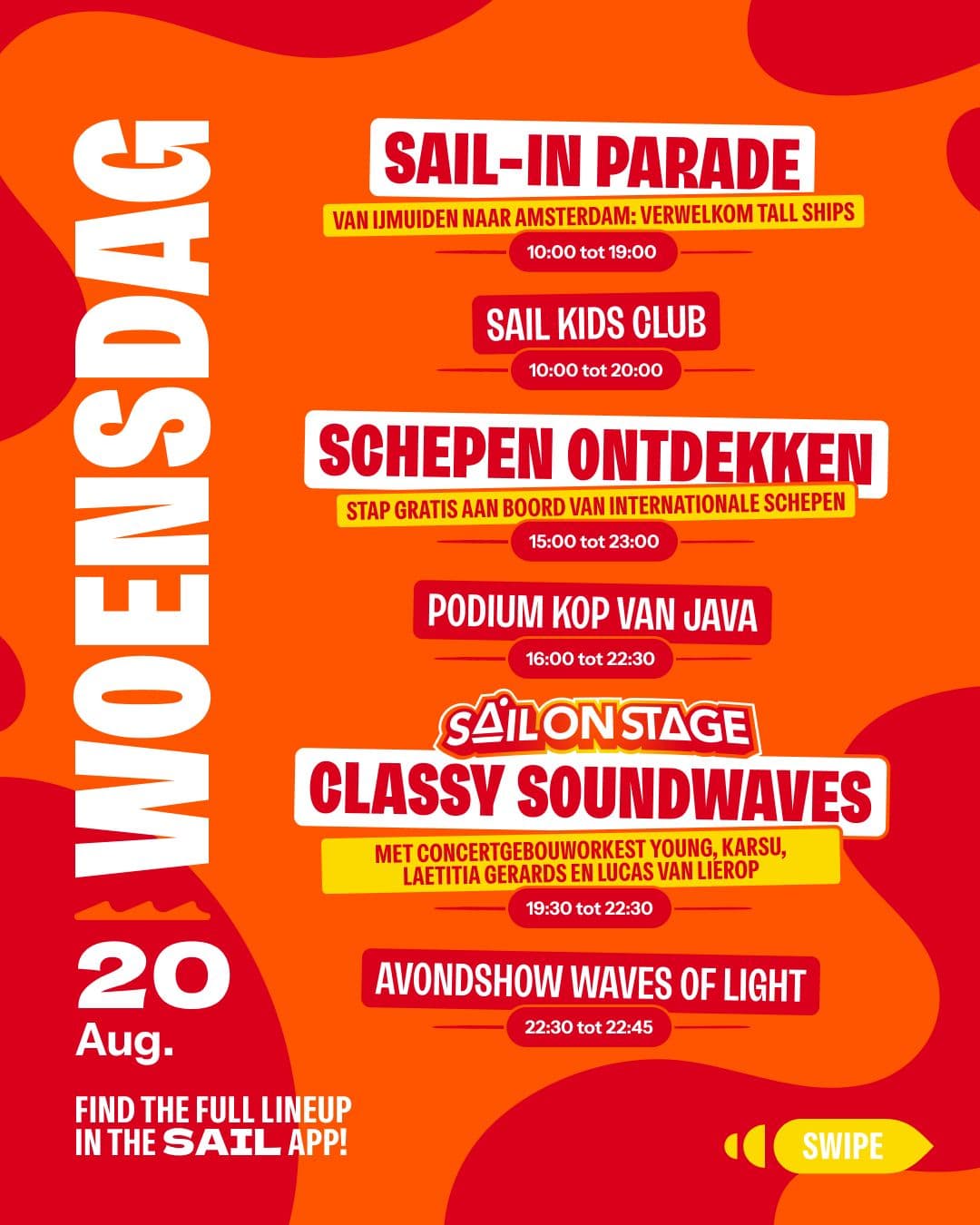 Vandaag starten we #SAIL2025 met lekker Hollands zomerweer: tussen de 14 en 23 graden, af en toe zon en een stevige bries. Perfect voor de SAIL-In Parade! Vergeet je zonnebrand niet, neem een windjack mee en blijf genoeg drinken. Zo geniet je optimaal van alle schepen op en rond het water. 🌊🧡