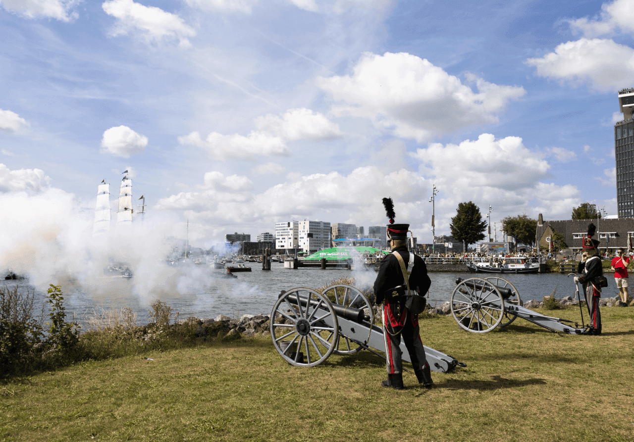 De Clipper Stad Amsterdam is zojuist de haven binnengevaren en heeft het officiële saluut protocollair ontvangen: hét ceremonieel welkom tijdens de SAIL-In Parade. Vanaf de kade bij de Sixhaven vuurt Saluutbatterij Naarden krachtige saluutschoten af, terwijl het volkslied van het land van herkomst klinkt. Tegelijkertijd stijgt rook in nationale kleuren op en wordt de vlag gehesen. Een indrukwekkend eerbetoon aan elk Tall Ship en haar bemanning – en de start van een eeuwenoude traditie die SAIL inluidt. 🌊🧡