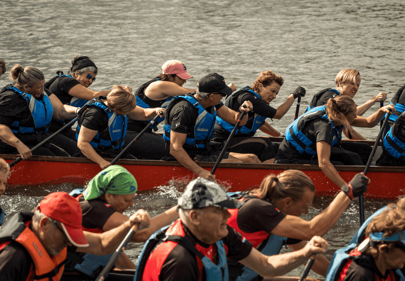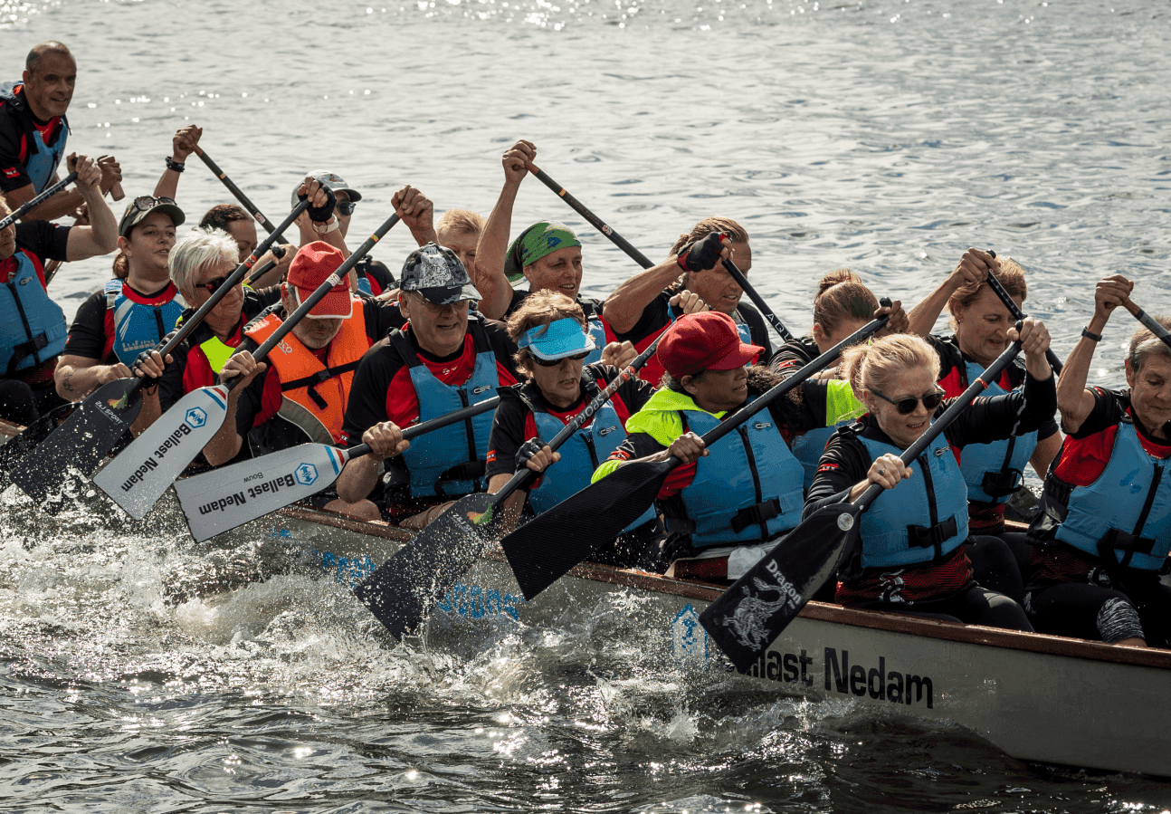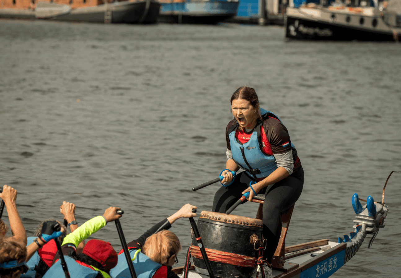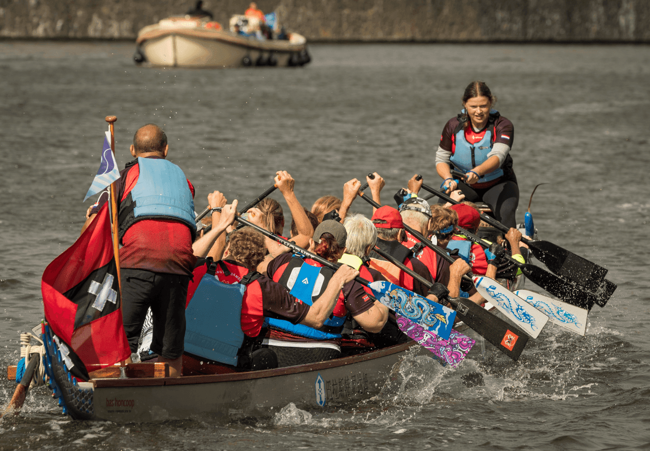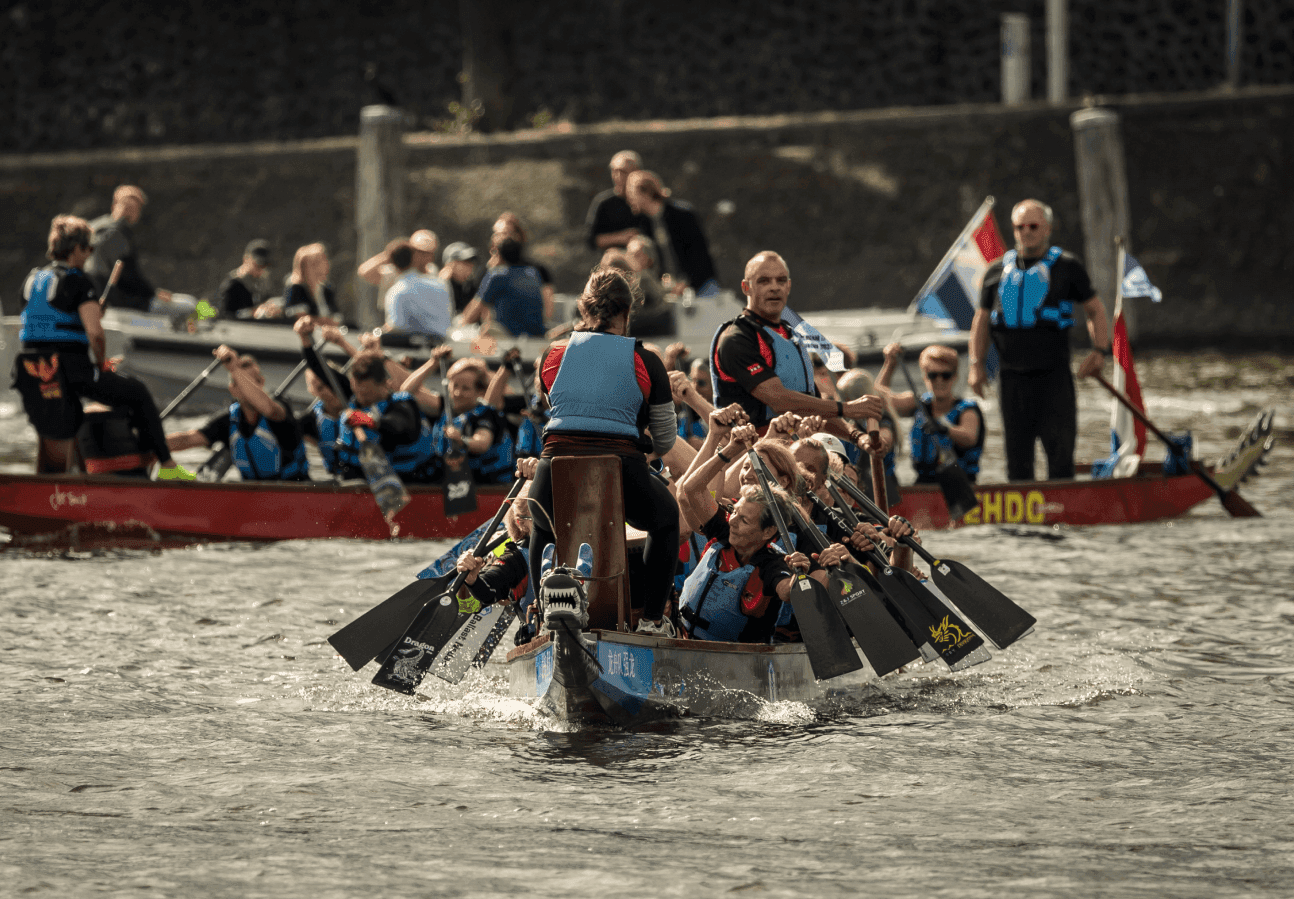 Even later voelen de drakenboten hun publiek goed aan en varen ze vlak langs de kade. De teams peddelen fanatiek op het ritme van de trommel en maken grote indruk. “Moeten ze de hele tijd zo hard heen en weer varen?” vraagt Tijn. “Ja, knap hè?” antwoordt zijn moeder. Tijn knikt tevreden.
