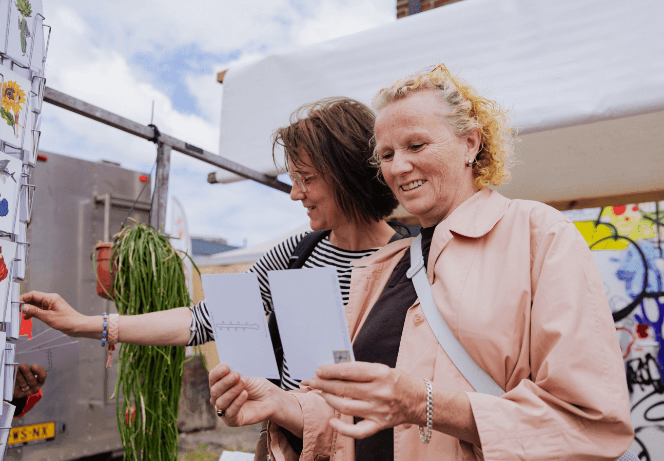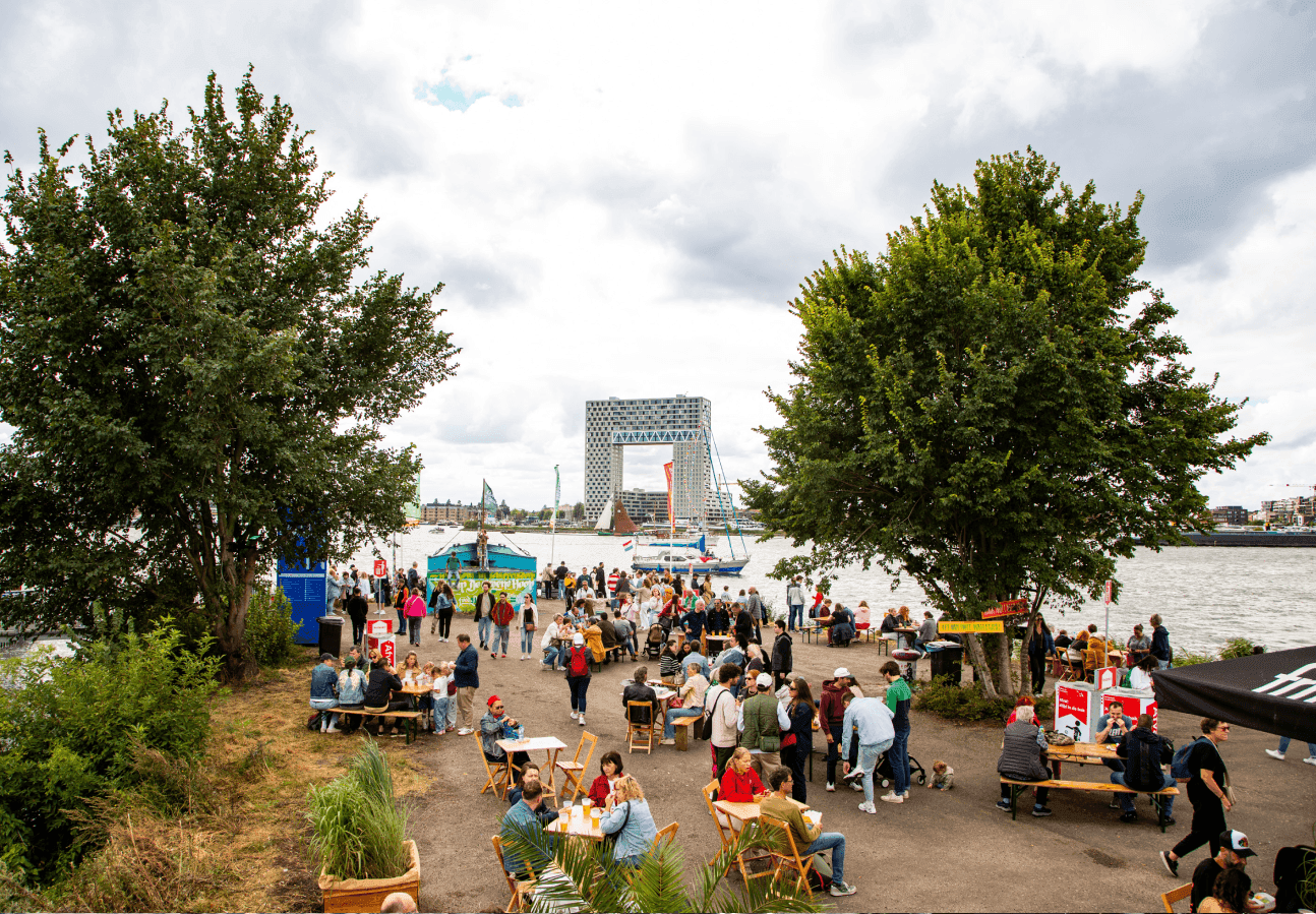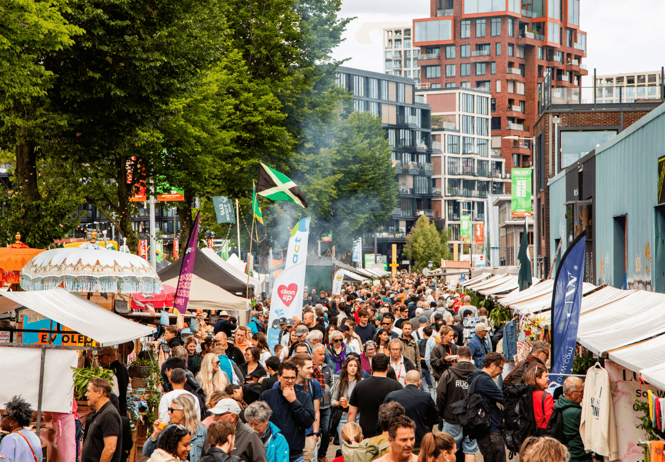 Even ontsnappen aan de drukte van de kades? Wandel langs de marktkraampjes vol verrassingen: eten, handgemaakte tasjes en schaaltjes van IJ-klei. 🎶 Terwijl live muziek klinkt, proef je de wereld.