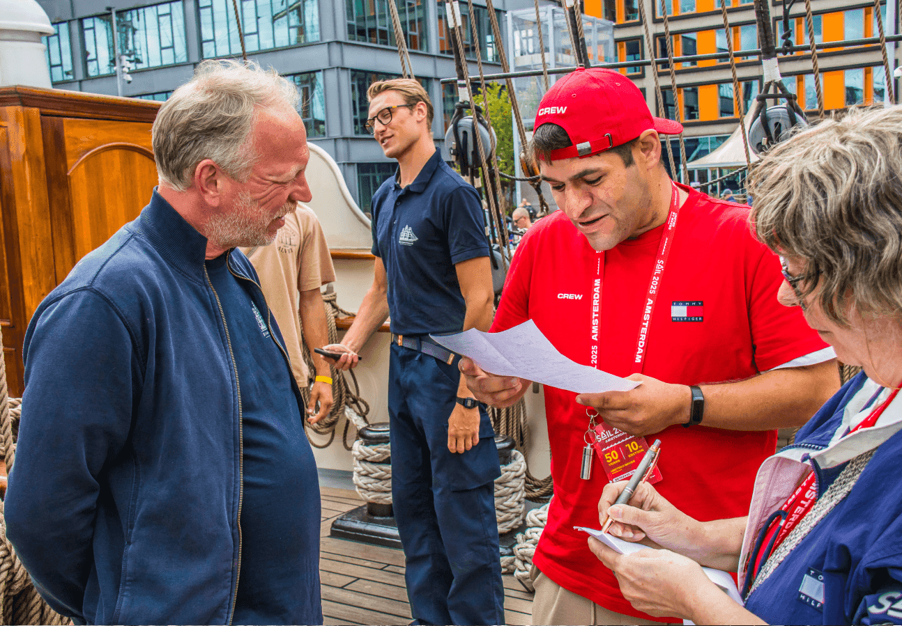 De dag begon rustig: vragen bedenken, aantekeningen maken, voorbereiden. Daarna ging Gino vol energie de kade op. Zijn eerste gesprek was met Alex (36) uit Zaandam: “Ik vind SAIL een supergaaf evenement. Tien jaar geleden was ik er ook en toen vond ik het al heel bijzonder. Ik weet nu al dat ik er de volgende keer weer bij ben. Mijn wens? Dat SAIL dan nog toegankelijker wordt.”