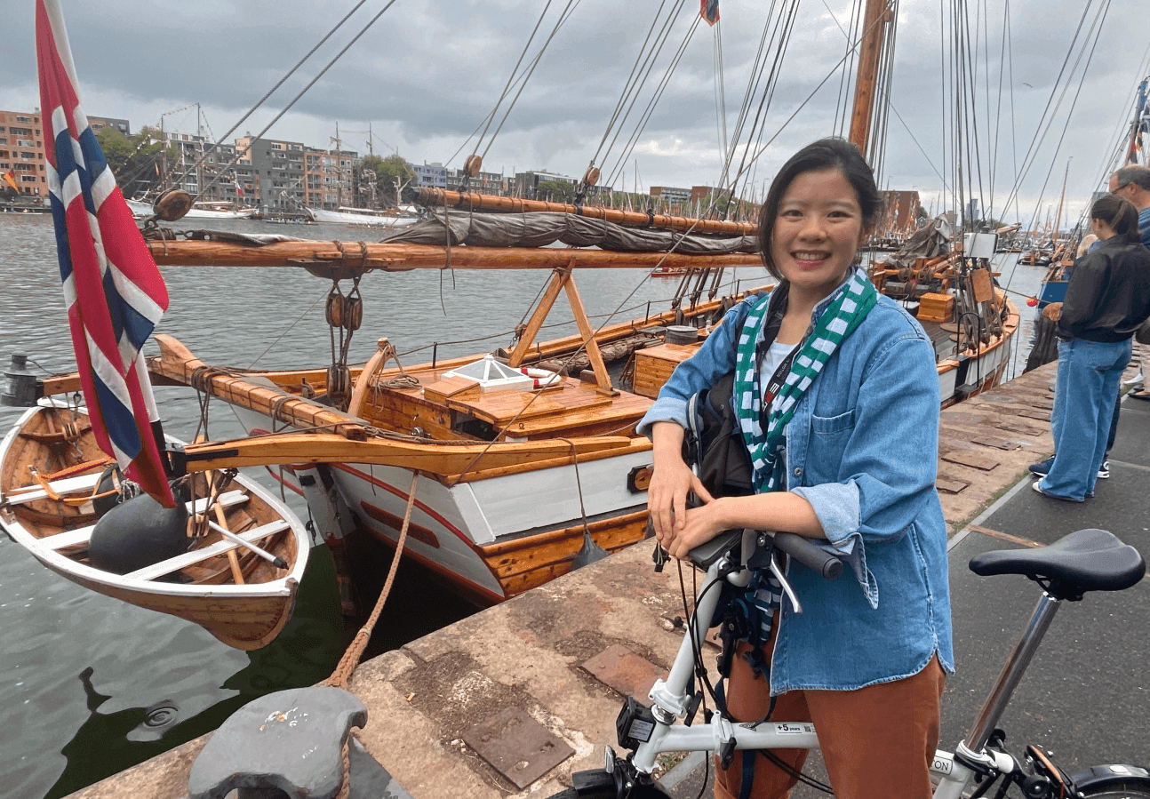 Joanna (40) uit Amsterdam is eigenlijk onderweg naar haar werk, maar stopt toch even. Want wie kan de charme van de IJhaven weerstaan? Op het water liggen talloze pleziervaartbootjes die tussen de Tall Ships dobberen en voor een levendig beeld zorgen.