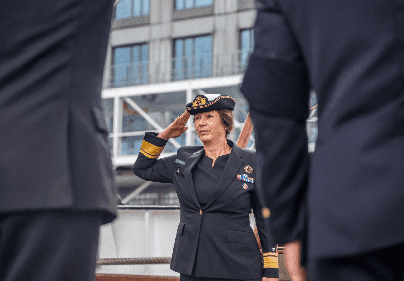 De gasten werden aan boord verwelkomd volgens militair protocol. Op het dek stond de bemanning in hun donkere uniformen opgelijnd. Een ontvangst vol traditie en discipline. Het contrast met de levendige drukte van de IJhaven maakte de plechtigheid des te indrukwekkender.