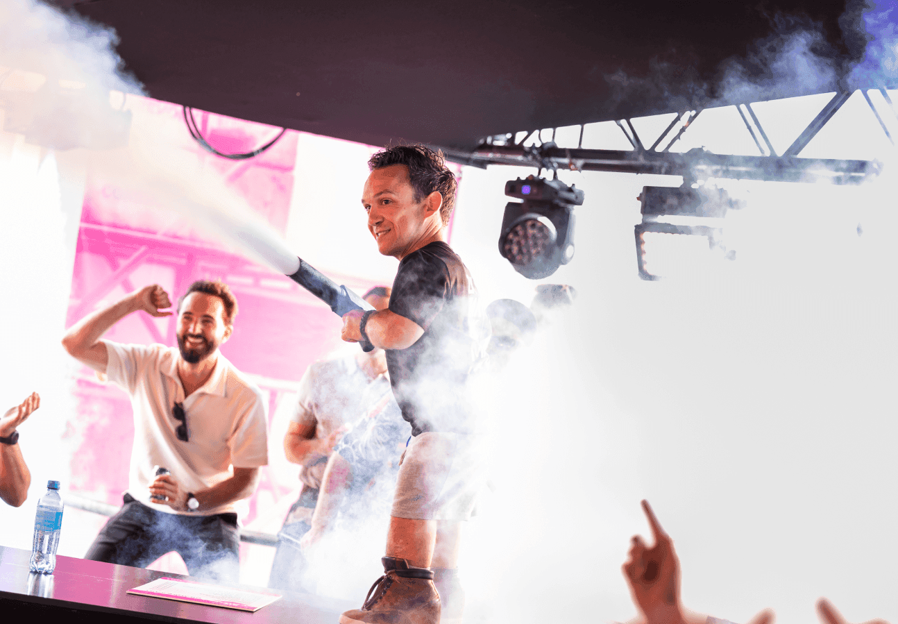 In het productiedorp lunchen drie merchandise-coördinatoren, even op adem na een drukke ochtend. Zij zorgen dat de verkooppunten bemand zijn en alles soepel verloopt. “Het gaat hartstikke goed,” vertellen ze. “’s Avonds moeten er zelfs extra shirts en hoodies gedrukt worden om aan de vraag te voldoen. We werken met hele leuke en flexibele vrijwilligers, Iedereen helpt mee waar dat nodig is.” 💪
