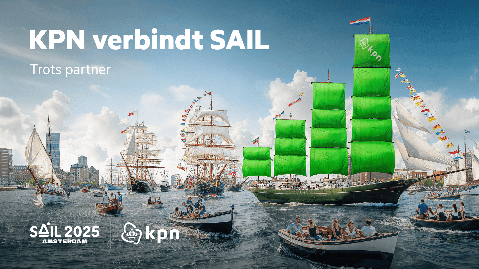 KPN is wederom aan boord als hoofdsponsor van SAIL! In 2025 keert het grootste vrij toegankelijke evenement van Nederland terug voor een driedubbel jubileum: de 10e editie en 50 jaar SAIL, tijdens de 750e verjaardag van Amsterdam. Van 20 t/m 24 augustus komen naar verwachting ruim twee miljoen bezoekers, crewmembers en schippers vanuit de hele wereld samen in onze jarige hoofdstad. ‘SAIL 2025: United by Waves’ staat voor vijf dagen verbroedering langs het IJ, met KPN als hoofdsponsor en onmisbare ‘connectivity-partner’.