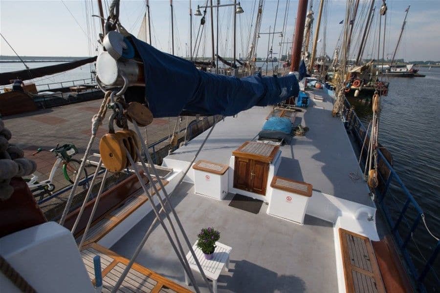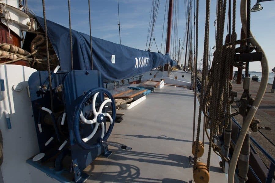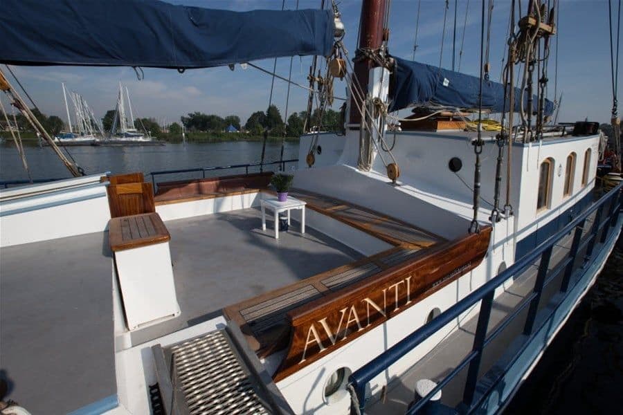 De Avanti is een statig witte verschijning. Het schip heeft een ruime indeling zowel boven- als benedendeks. Op het stralend witte dek met houten accenten kun je lekker achteroverleunen en genieten van SAIL.