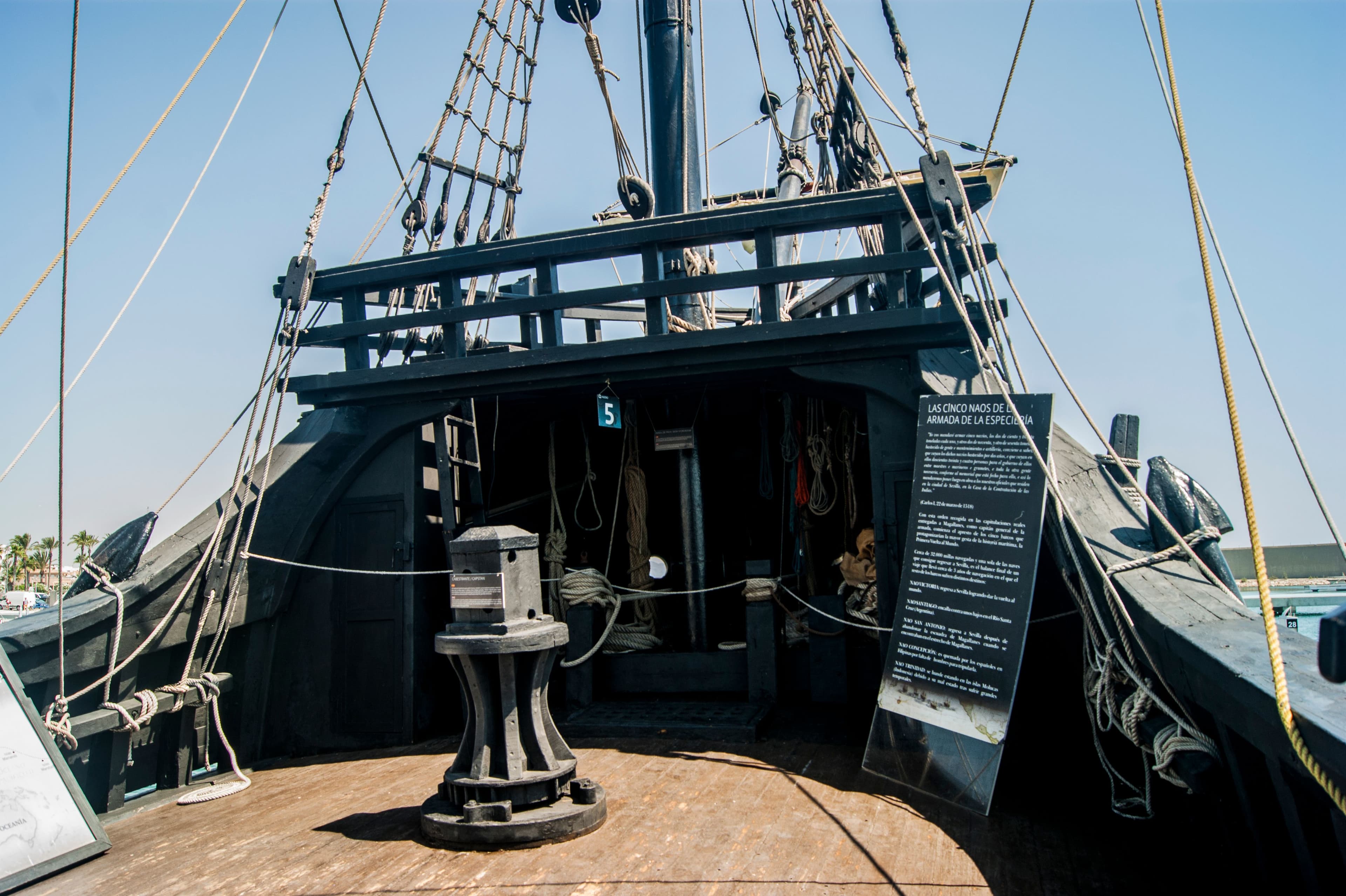 Dit oorspronkelijke 16e eeuwse schip, was de enige van vijf schepen, die behouden terugkeerde in Sevilla nadat zij tussen 1519 en 1522 een reis rond de wereld had gemaakt. Het eerste schip ooit!