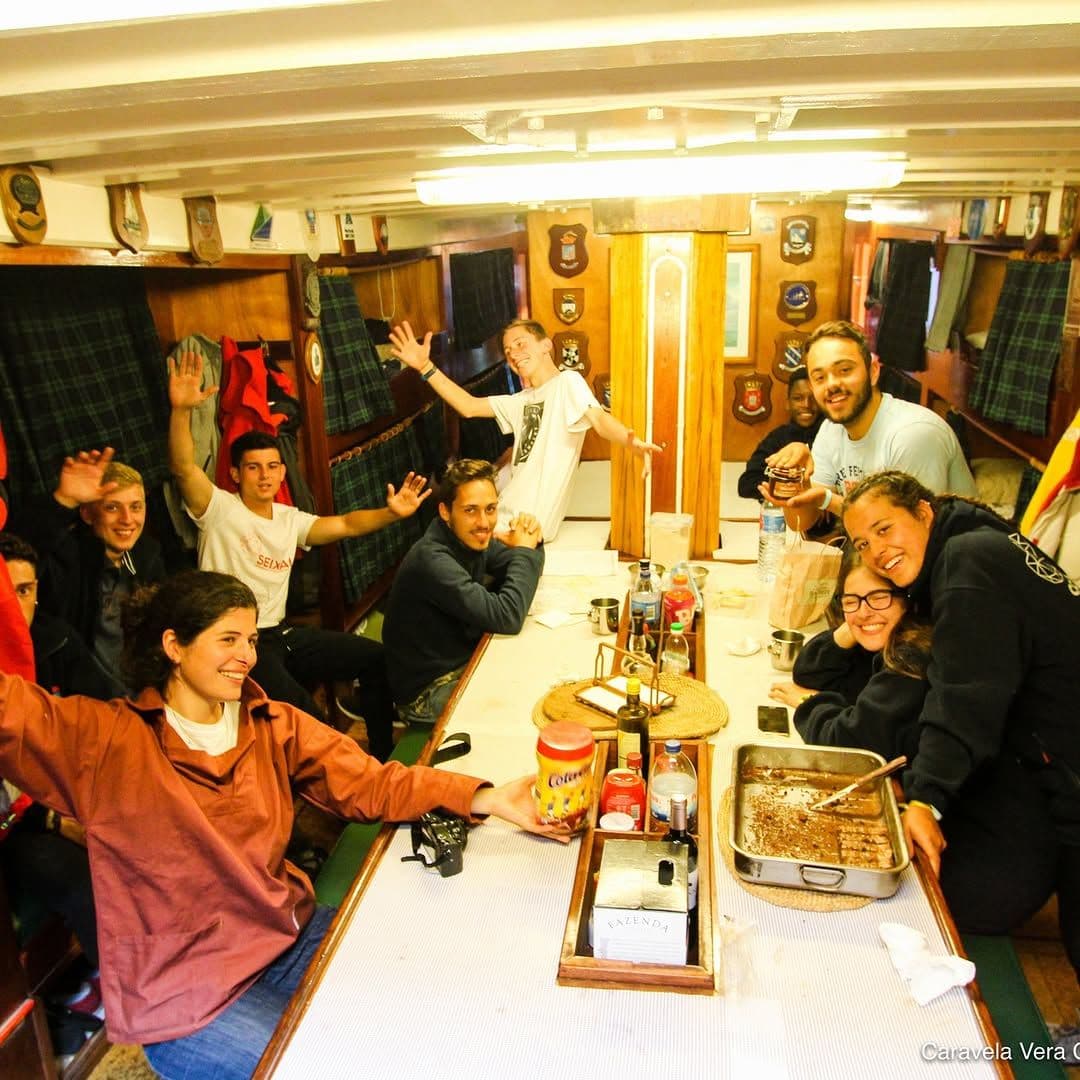 De Caravela Vera Cruz wordt bemand door vrijwilligers van Aporvela, die zich inzetten voor trainingsreizen en zeilervaringen, met een nadruk op educatie en jeugdontwikkeling.